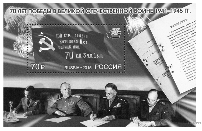 Укажите название месяца и год, когда произошло событие, которое запечатлено на фотографии, помещённой в нижней части почтового блока. Укажите два любых события из истории Великой Отечественной войны, произошедших не более чем за один месяц до этого события.